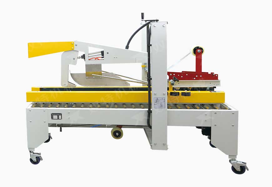 自動折蓋封箱機可手動調節紙箱大小,適合同種規格紙箱同時段封箱;操作簡單、使用方便、容易調整、封箱速度快、效率高、堅固耐用。可單機使用,也可與貼標機、旋蓋機、熱收縮膜包機等後道包裝流水線配套使用。